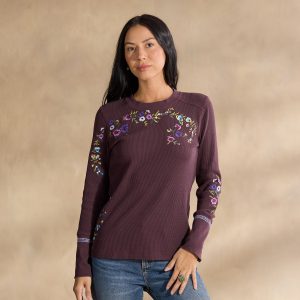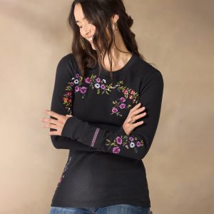 A Sundance classic body in new floral embroidery. our comfortable crewneck thermal boasts wide cuffs accented with velvet trim detail and metal buttons. Cotton/spandex. Machine wash. Imported. Exclusive. Sizes XXS (00). XS (0–2). S (4–6). M (8–10). L (12–14). XL (16–18). Approx. 23.5l.