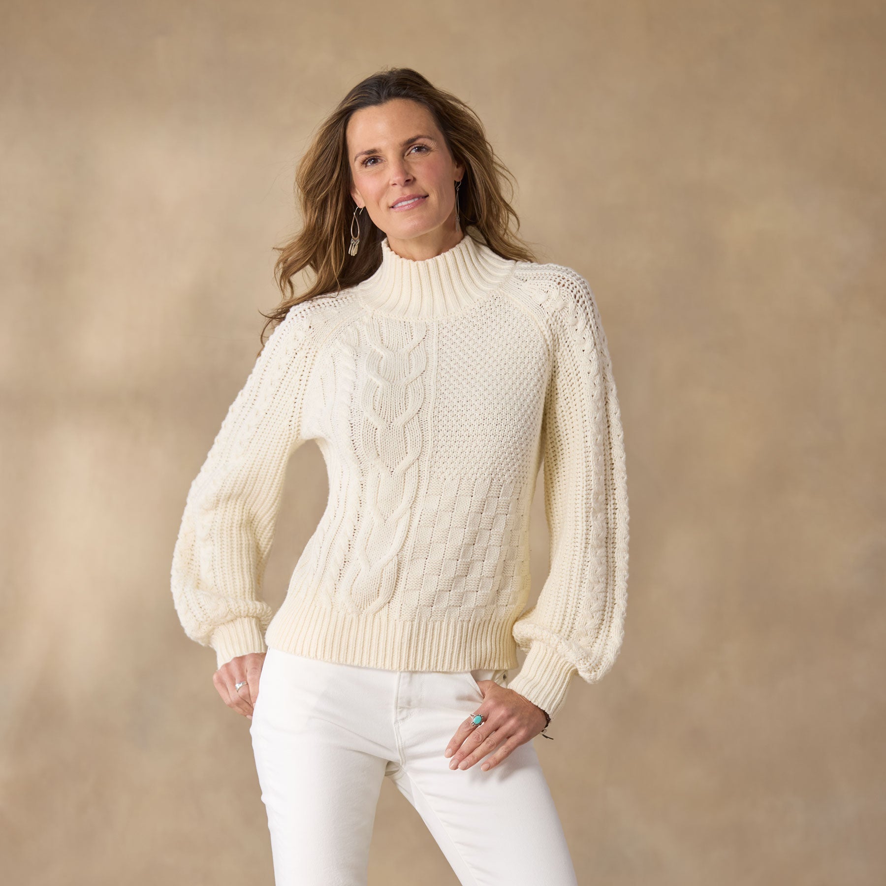 A celebration of texture. our patchwork-inspired mixed stitch pullover pleases so with a tonal marled look. mock turtleneck. rib trim and subtle volume sleeves. A great everyday staple. Cotton/acrylic. Hand wash. Imported. Exclusive. Sizes XS (0–2). S (4–6). M (8–10). L (12–14). XL (16–18). XXL (20–22). Approx. 23l.