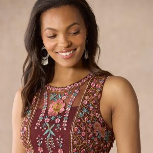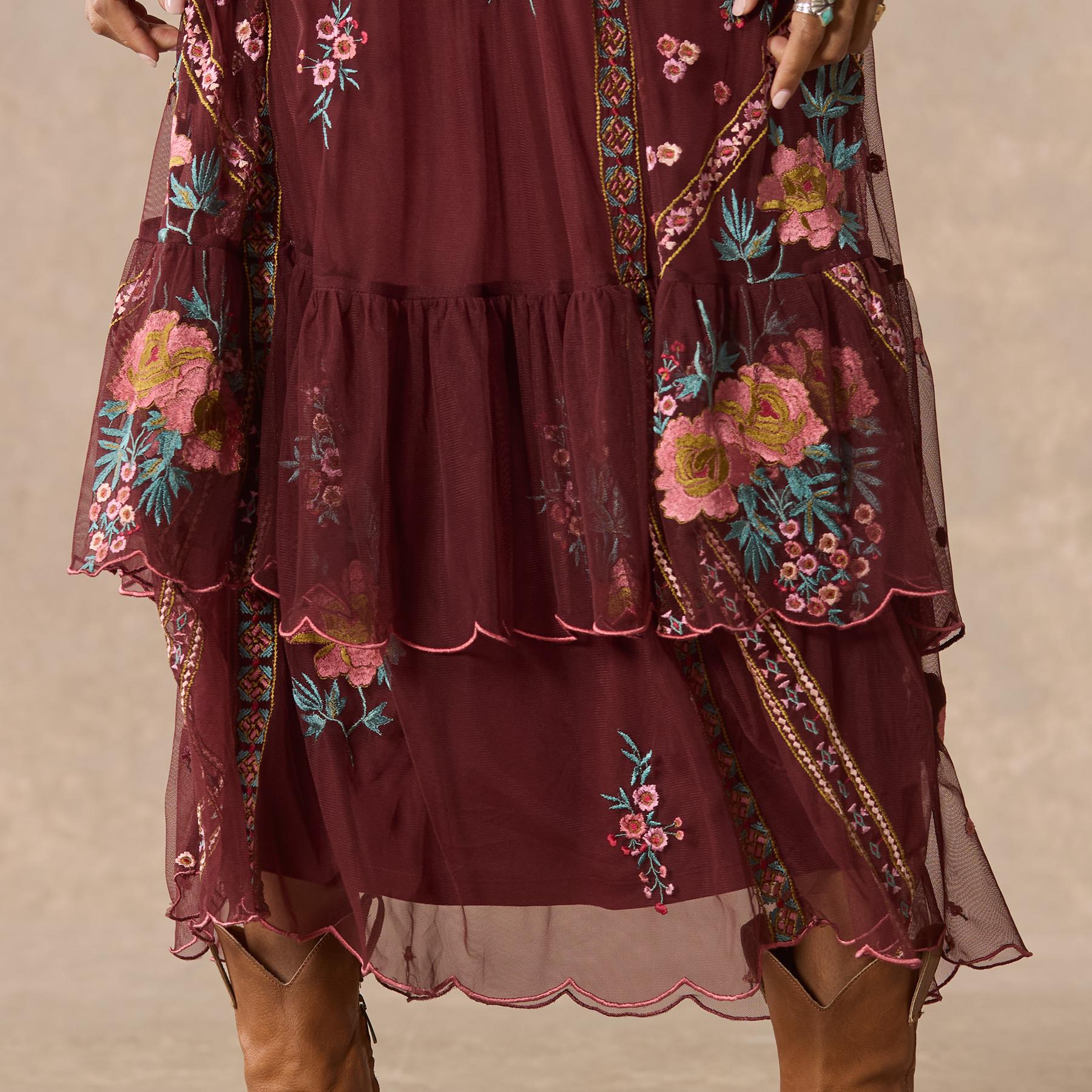 Our lovely fit and flare embroidered mesh dress features pretty florals mixed with geometric embroidery and a beautiful jewel neckline. Side zipper for an easy fit. Nylon. Hand wash. Imported. Exclusive. Sizes XS (0?C2). S (4?C6). M (8?C10). L (12?C14). XL (16?C18). XXL (20?C22). Approx. 54l.