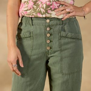 Our relaxed-fit Rivera Pants feature a classic straight-leg fit with a flat-front waist and comfy elastic back—plus pretty ladder lace on the patch pockets. Cotton/linen. Machine wash. Imported. Exclusive. Sizes 2–16. 28 inseam.