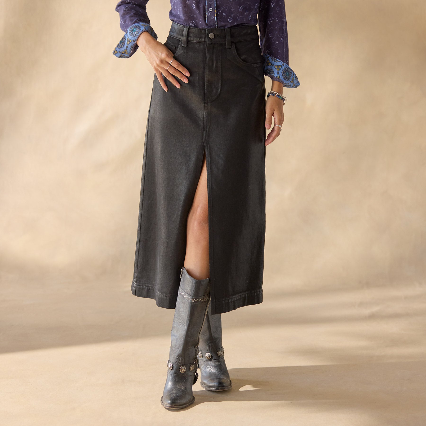 Our stylish oh so easy to wear coated denim skirt takes a classic look and adds a special touch with five pockets. button and zip fly closure and a sophisticated center front slit. Cotton/lycra. Machine wash. Imported. Exclusive. Sizes 24?C32. Approx. 31l.