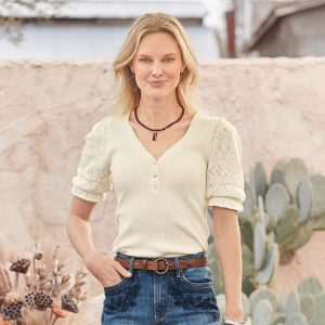 Experience the essence of luxury in our feminine and fitted V-neck henley. so soft in our Legends Lightweight Yarn. Beautiful pointelle at the bold puff sleeves and special scalloped trim details add an extra touch of grace. Organic cotton/nylon/spandex. Machine wash. Imported. Exclusive. Sizes XS (0??). S (4??). M (8??0). L (12??4). XL (16??8). XXL (20??2) Approx. 22.5l.