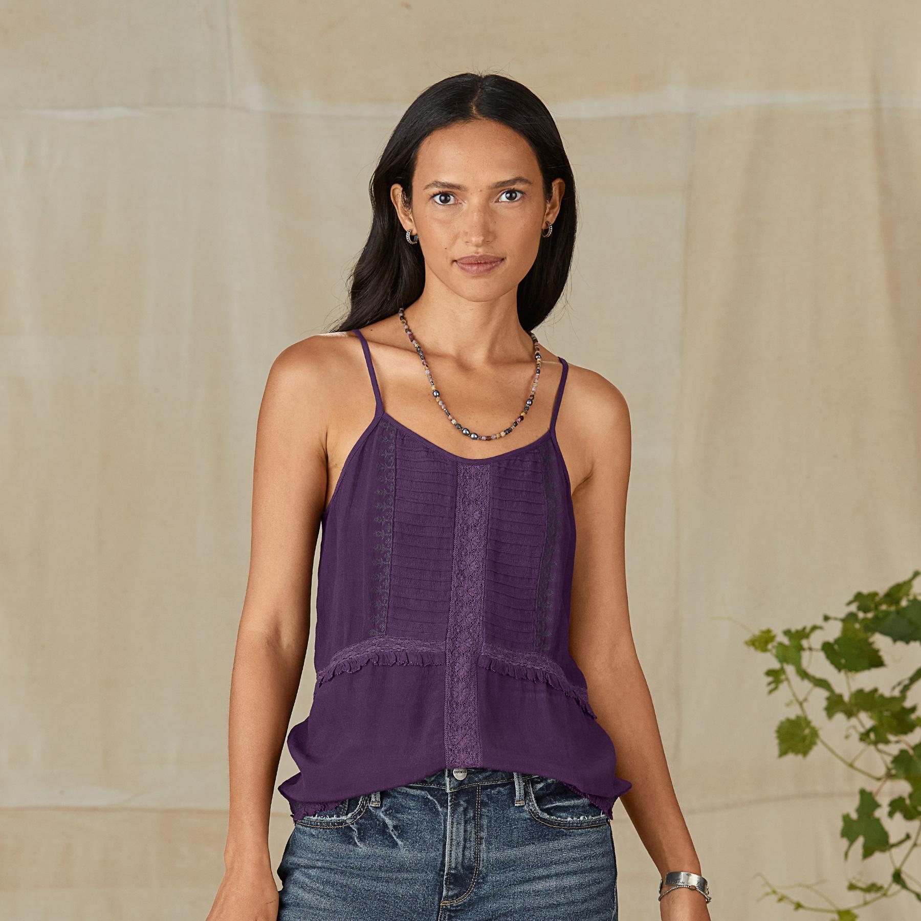 Drawing inspiration from vintage beauty. our lovely camisole is graced with lace insets. pintuck details. tonal embroidery and ruffles. Viscose. Machine wash. Imported. Exclusive. Sizes XS (0-2). S (4-6). M (8-10). L (12-14). XL (16-18). XXL (20-22). Approx. 24.5l.