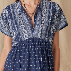 Loose. pop-over style in two contrasting prints reminiscent of a bandana. Open neck with tassels. Cotton. Hand wash. Imported. XS (0 to 2). S (4 to 6). M (8 to 10). L (12 to 14). XL (16 to 18). XXL (20 to 22). Approx. 47L.